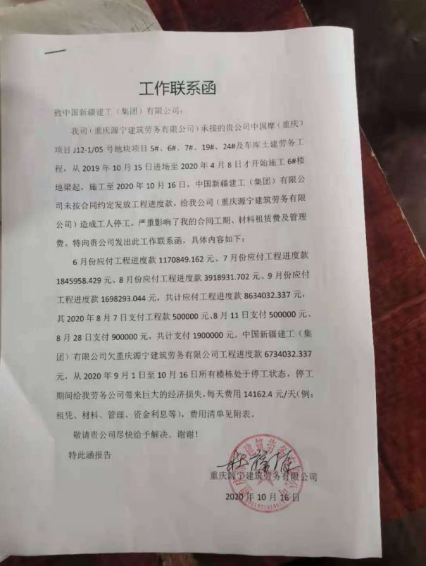 重庆源宁建筑劳务公司中国摩重庆项目现场经理宴某表示,劳务公司与中国摩重庆项目总包方新疆建工签订有劳务分包协议,从2019年10月15日进入中国摩重庆项目J12地块施工现场,真正开始施工是今年4月8日,当时做的是6#楼地梁,施工至10月16日,中国新疆建工(集团)有限公司未按合同约定发放工程进度款,公司多次协调无果,最后造成最后工程停工,目前农民工的情绪激动,劳务公司正在积极努力,争取让建筑总包方新疆建工履约,以便平息事态。
