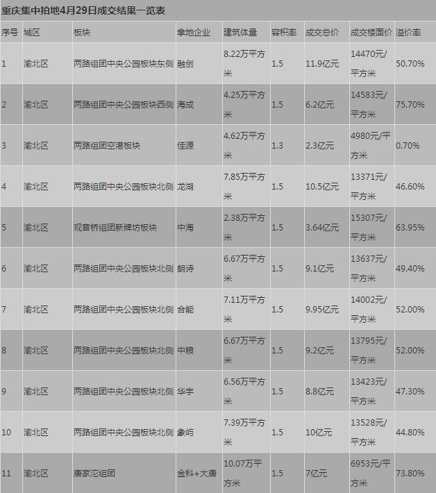 4月29日拿地的企业当中,融创和保利成了最大的赢家。其中融创将3块土地收入囊中,包括1块独立拿的两路组团中央公园板块的土地,成交总价11.9亿元,成交楼面价14470元/平方米;与弘阳和中梁联合拿的巴南区界石组团的两块土地,总计25万平方米,总价11.29亿元。