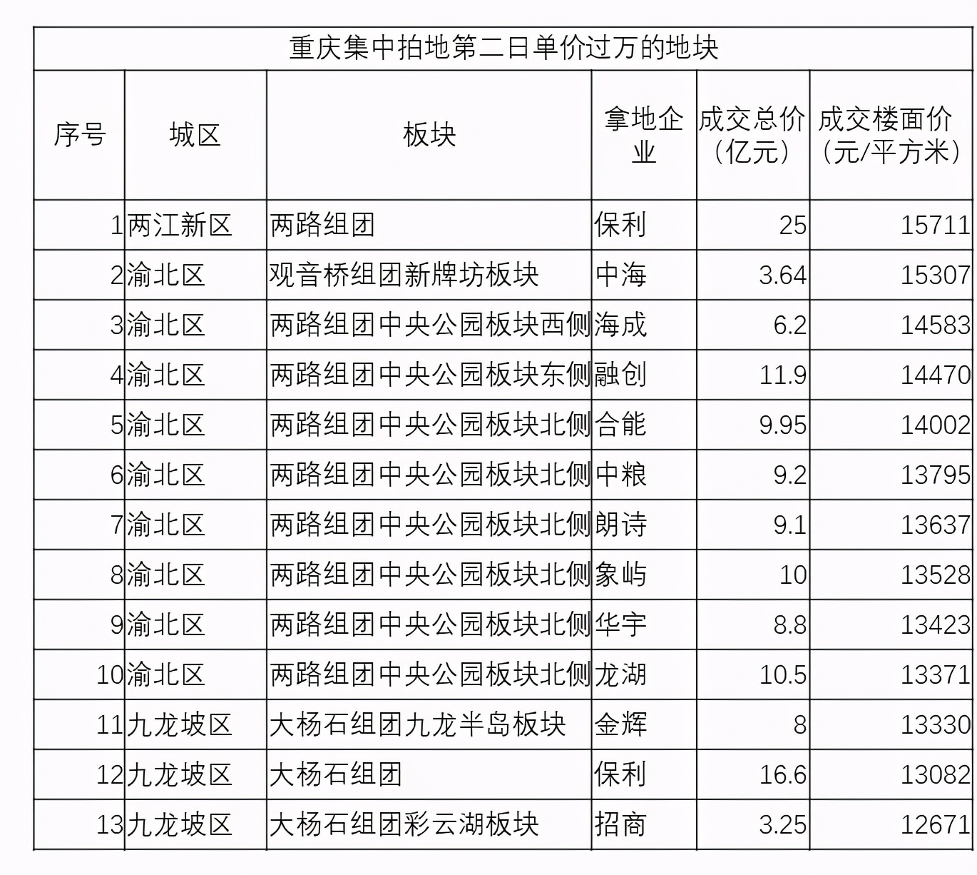 重庆集中拍地第二日战报:楼面地价屡创新高 万元地成主流