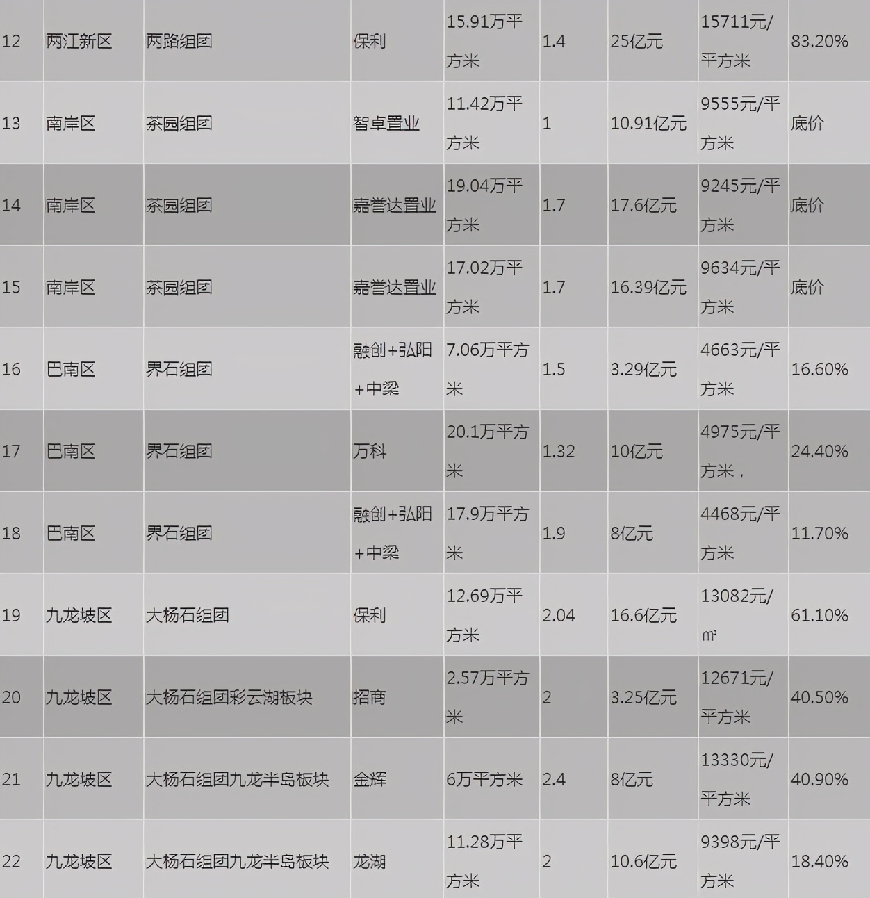 保利当日独立拿了2块地,除了两路组团的“单价地王”之外,还以16.6亿元拍下了九龙坡区大杨石组团的12.69万平方米的地块,成交楼面价13082元/平方米,溢价率达到了61.1%。两块地总价达到了41.6亿元。以83%和61%的溢价率奋勇抢地,体现出了保利作为央企“不差钱”的底气。