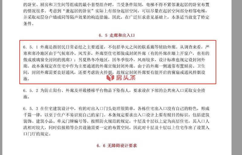 在住建部的这份《住宅设计规范》中具体表述是:外廊是指居民日常必经之主要通道,不包括单元之间的联系廊等辅助外廊。从调查来看,严寒和寒冷地区由于气候寒冷、风雪多,外廊型住宅都做成封闭外廊(有的外廊在墙上开窗户,也有的做成玻璃窗全封闭的挑廊);另夏热冬冷地区,因冬季很冷,风雨较多,设计标准也规定设封闭外廊。故本条规定在住宅中作为主要通道的外廊宜做封闭外廊。