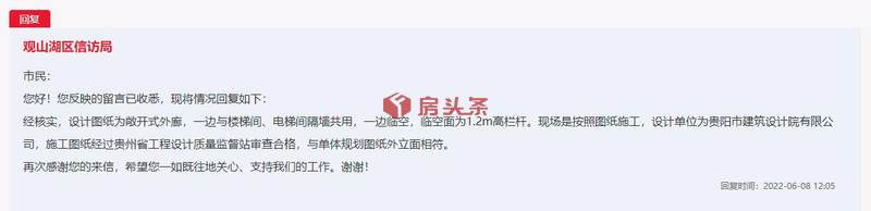 在回复中,观山湖区信访局表示,经核实,设计图纸为敞开式外廊,一边与楼梯间、电梯间隔墙共用,一边临空,临空面为1.2m高栏杆。现场是按照图纸施工,设计单位为贵阳市建筑设计院有限公司,施工图纸经过贵州省工程设计质量监督站审查合格,与单体规划图纸外立面相符。