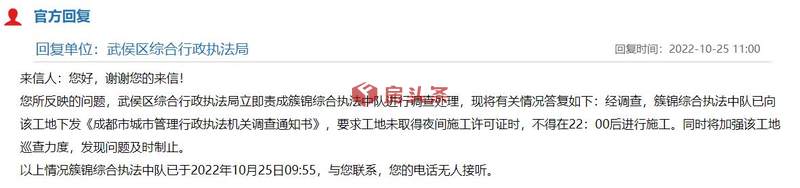 在回复中,武侯区综合行政执法局表示,簇锦综合执法中队已向该工地下发《成都市城市管理行政执法机关调查通知书》,要求工地未取得夜间施工许可证时,不得在22:00后进行施工。同时将加强该工地巡查力度,发现问题及时制止。