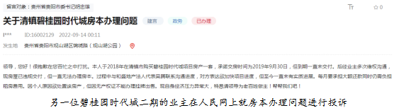 人民网留言版上ID号为ID:16002129的碧桂园时代城二期的业主,也在投诉留言中说道称,自己于2018年在清镇市购买碧桂园时代城项目房产一套,承诺交房时间为2019年9月30日,但到期一直未交付,后经业主多次维权沟通,现房屋已违规交付,但一直无法办理房本,每月要承担大额还款同时仍需负担租房费用,因其个人原因欲处置该房产,但因无产权证不能办理挂牌出售。