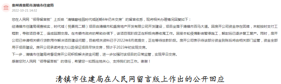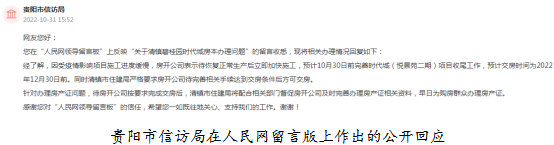 对于以上问题,贵州省贵阳市清镇市住建局已高度重视,并于上月21日在人民网留言版上作出公开回应称,经清镇市住建局调查核实,时代城(悦景苑二期)项目由清镇市和盛房地产开发有限公司开发建设,因房开公司资金存在困难,未能按时支付工程款,导致项目停工,造成延期交房。在市委市政府的帮助协调下,该项目现阶段正在积极完善收尾工作。