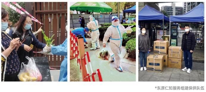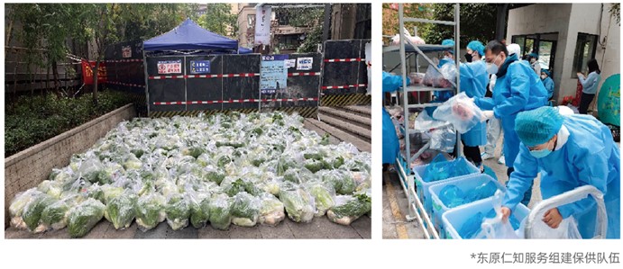同时东原仁知还在各个项目建立了统一的保供服务队伍,负责给封控业主提供线上咨询、物资分拣配送、商品售后等服务。特别是一些重点封控、无法进出的楼栋,保供服务队伍与社区志愿者一起将物资进行分拣、单独配送至封控楼栋大堂。