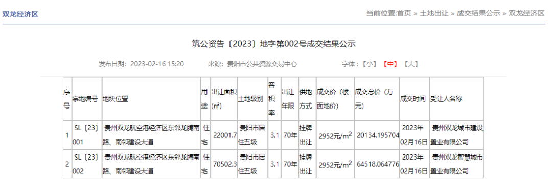 2月16日,贵阳市公共资源交易中心发布筑公资告〔2023〕地字第002号成交结果公示。位于双龙经济区的SL〔23〕001、002号地块出让,总成交金额84652.26万元,总成交面积92504平方米。