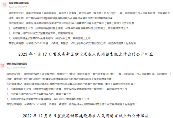 重庆高新区建设局在1月17日的回应中表示,已要求富力地产方面合理安排施工计划,抓紧完成相关楼栋的建设,尽快达到相关楼栋的交付条件;专班组分别于2023年1月5日、1月10日组织协调3A组团延期交付的业主代表和富力地产负责人召开了沟通协调会,要求富力地产落实市场主体责任和法律责任;并建议业主可先行跟富力地产方面协商解决逾期交房事宜,协商解决不成,可在收集相关证据后向法院提起诉讼依法解决。这样看来,对于业主所追问的重庆富力院士廷二期3A组团18栋交付延期后的损失赔偿一事,看来还需要一定的时日才能最终“尘埃落定”。