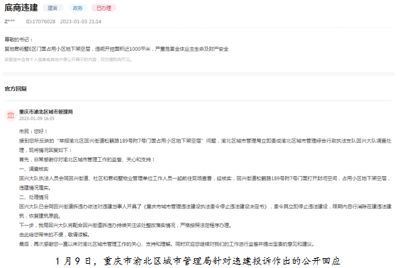 2023年1月3日重庆,一业主在人民网留言板上投诉留言称,“复地君屿墅E区门面占用小区地下架空层,违规开挖面积近1000平米”。2023年1月9日,重庆市渝北区城市管理局对此作出公开回应称,回兴大队已会同回兴街道拆违办依法对违建当事人开具了《重庆市城市管理违法建设执法责令停止违法建设决定书》,责令其立即停止违法建设,限期内自行消除在建违法建筑,恢复建筑原貌。