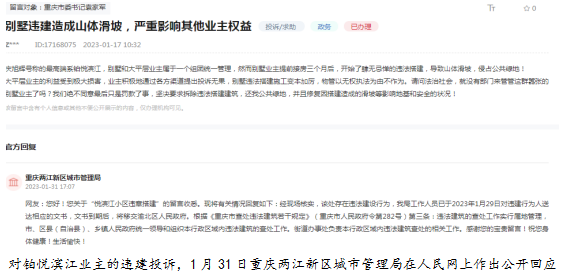 类似涉嫌侵占业主公共绿地的,在位于重庆市渝北区悦来生态城高义口路、由旭辉、华侨城和华宇联合打造的铂悦滨江小区1月17日也被业主在网上公开举报投诉中说道:“别墅业主提前接房三个月后,开始了肆无忌惮的违法搭建,导致山体滑坡,侵占公共绿地,大平层业主的利益受到极大损害……”对此,1月31日重庆两江新区城市管理局在人民网留言板上的公开回应中表示,经现场核实,该处存在违法建设行为,该局工作人员已于2023年1月29日对违建行为人送达了相应的文书。