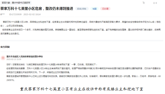 对于底楼业主私挖地下室涉嫌的违法,2月2日在重庆蔡家万科十七英里小区14栋就出现了这样的业主投诉,2月13日重庆市北碚区人民政府蔡家岗街道办事处在公开回应中公开表示,经街道现场实地查看,万科十七英里小区14栋业主有使用地下室的情况。街道严格按照重庆市第282号令等规定并结合街道对辖区违法建筑处置职能职责,已对该户违建依法依规进行立案查处并发放相关文书,下一步将督促业主及时整改回填。
