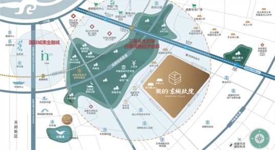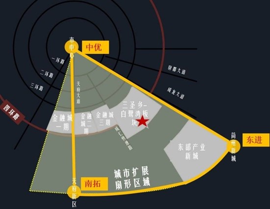 黄金三角区的核心即是三圣乡。三圣乡优势得天独厚,全域均在绕城内,是成都主城区生态资源最好的区域之一,承接东大街一脉向东外溢发展。