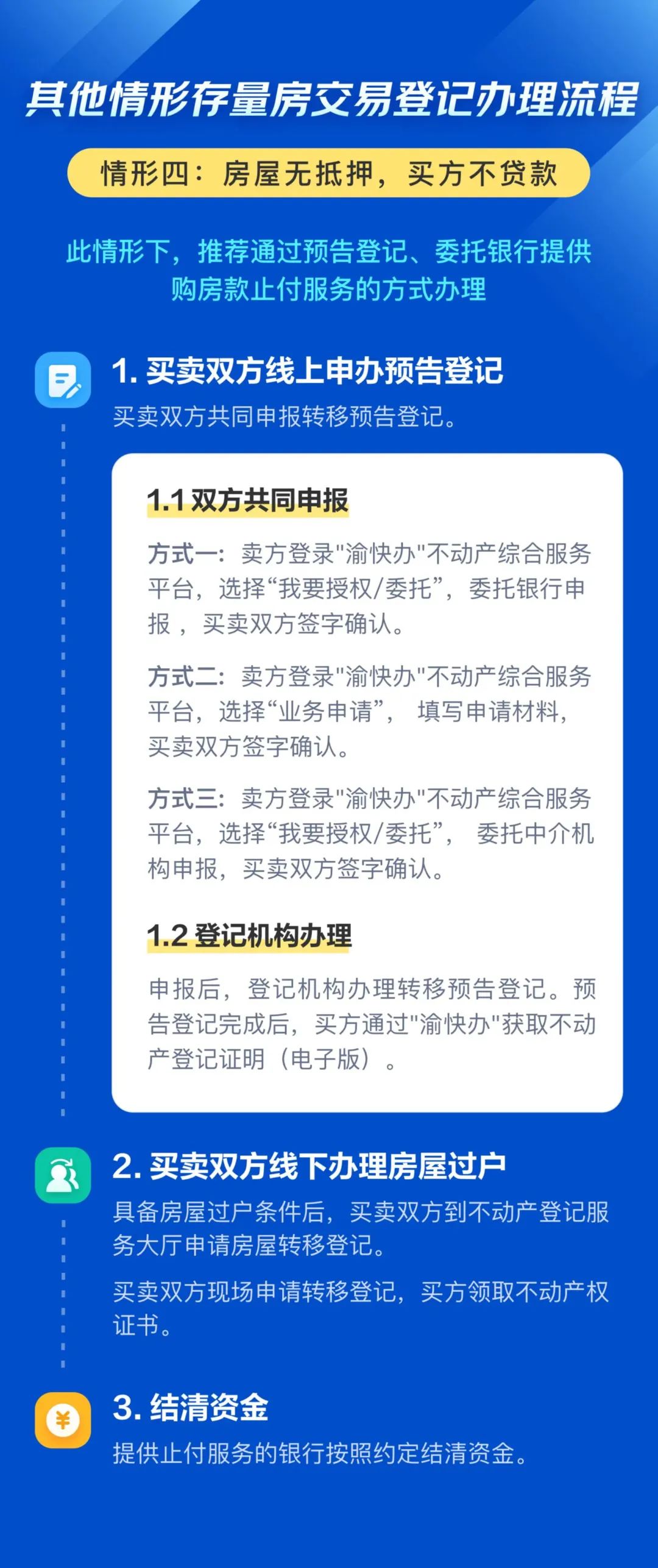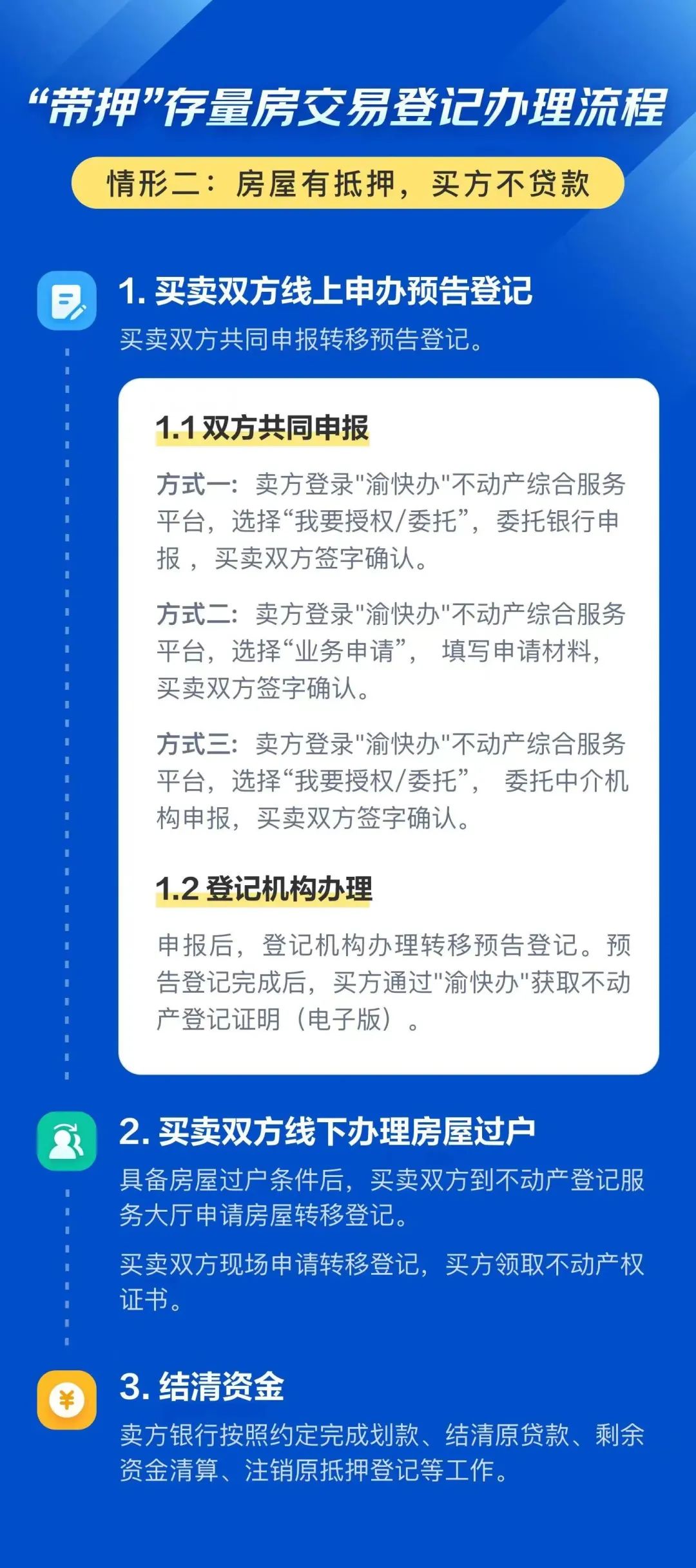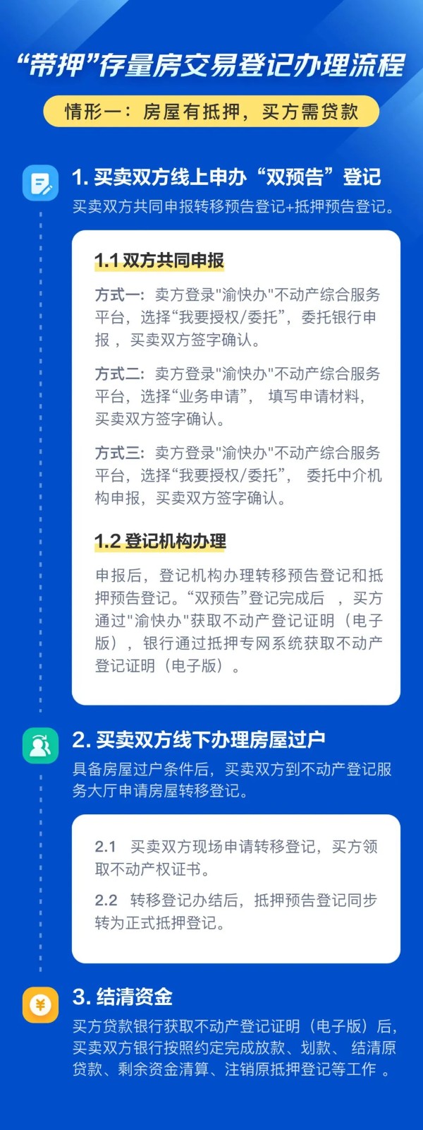 3月20日,重庆市规划自然资源局发布《重庆市存量房交易登记办事指南》,针对二手房买卖双方在同一银行贷款的,全面实施二手房双预告“带押过户”。