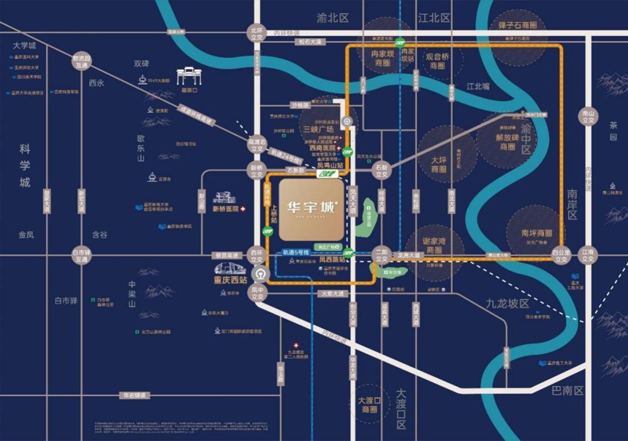 华宇城占位沙区核芯,凤天大道板块,项目3公里范围内汇聚沙区优质城市资源,周边重庆图书馆、西南医院、新桥医院、陆军军医大学、区政务中心等优渥配套交织,拥享凤凰广场、彩云湖湿地公园等4大公园环绕生态密境。