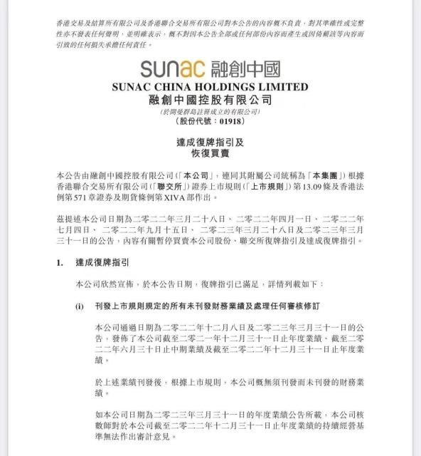 2023年4月12日融创中国发布了一则官宣复牌的公告,此次成功复牌,重点解决了两个重要因素:债务重组情况和资产持续经营性。除此之外,为了重新复牌,融创还加大了财务系统的完建。