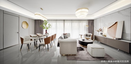 在室内设计上,黄立群深刻理解城市家庭对于敞轩明室的追求,迎合共享、交流的无界感需求。因此,追求方正、开阔的设计,通过极大的面宽和宽景阳台,创造出引人入胜的宽景效果。奢石和金属的点缀,使得精致之美在每一个细节中得以彰显,为城芯奢宅赋予触手可及的质感,这也造就了润府对空间美学的极致探索。
