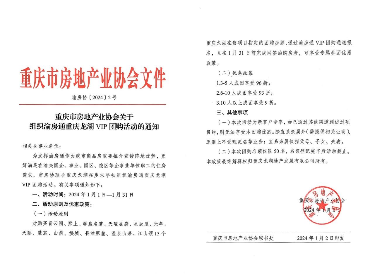 同时,为更好满足在渝央国企、事业、园区、院区等企事业单位职工的住房需求,重庆市房地产业协会也联合重庆龙湖,同步组织开展渝房通重庆龙湖VIP 团购活动。