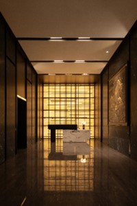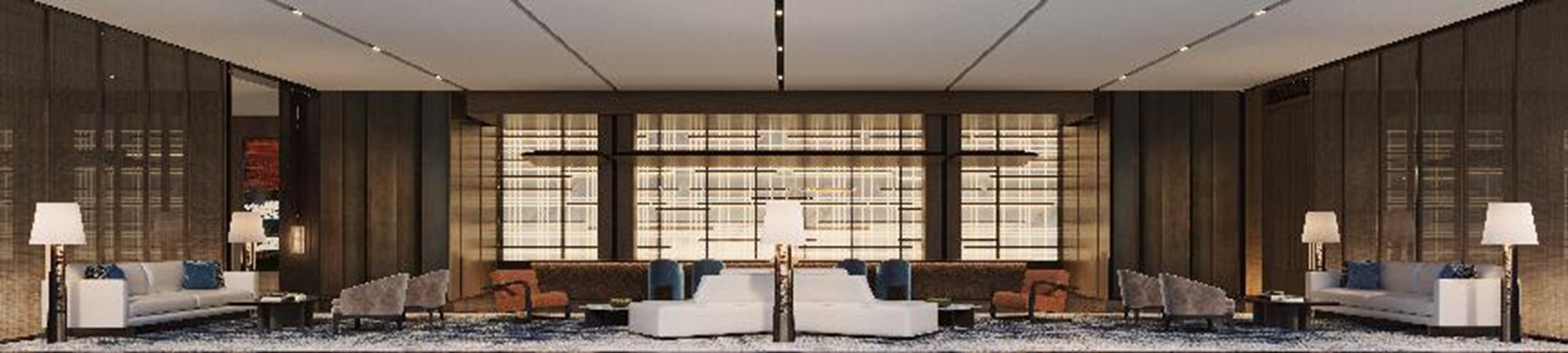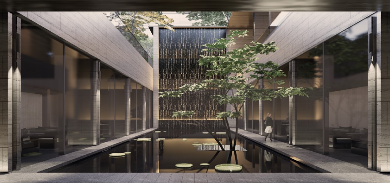 中庭以水为引,七道云上水渠串联高尔夫草坪及名贵花木,勾勒都市金线上的水上花园。罕见约12m天空云瀑,以挪威森林天然石材为背景,从高处汇入约250㎡下沉式庭院,营造禅意云河。