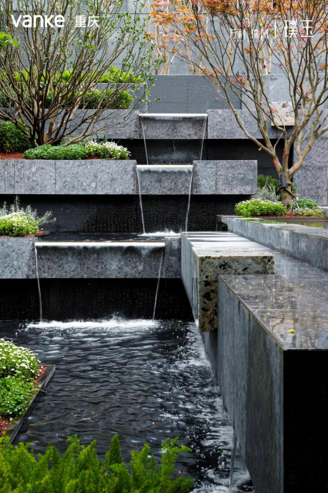三重入户礼序匠著下沉庭院,利用场地高差,结合建筑空间,用渐变玻璃砖打造约7.5m的粼云飞瀑,包含瀑水、跌水、静水等多种水景,形成赖特“流水别墅”般的山水意境,以山地层次景观、层峦叠水庭院,抒写隽永隐贵的居所风范。