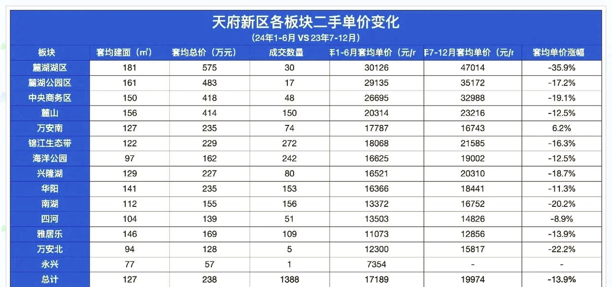 根据最新统计数据,在2024年1月至7月,天府新区成都直管区商品房成交均价为17189元/平方米,与2023年下半年度的19974元/平方米相比,跌幅约为13.9%。
