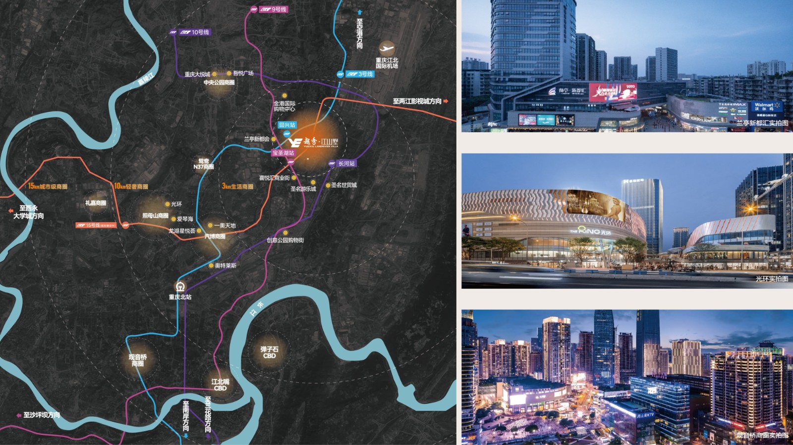 从地理位置来看,江山墅位于重庆北区的地理中心——重庆渝北核心区回兴板块,紧邻机场路,周边3号、10号、9号和15号等4条轻轨线,附近是轨道9号线和15号线的交汇站宝圣湖站,周边生活配套丰富,商业资源有阑亭星都汇、汽博商圈;医院有重医附三院、渝北妇幼保健院;学校有回兴小学、八中管理校黄炎培中学、一中寄宿学校等,这些配套都在项目3公里范围内。项目旁边还有多条社区商业街,生鲜超市、餐饮美食、休闲娱乐应有尽有,人间烟火气浓郁。