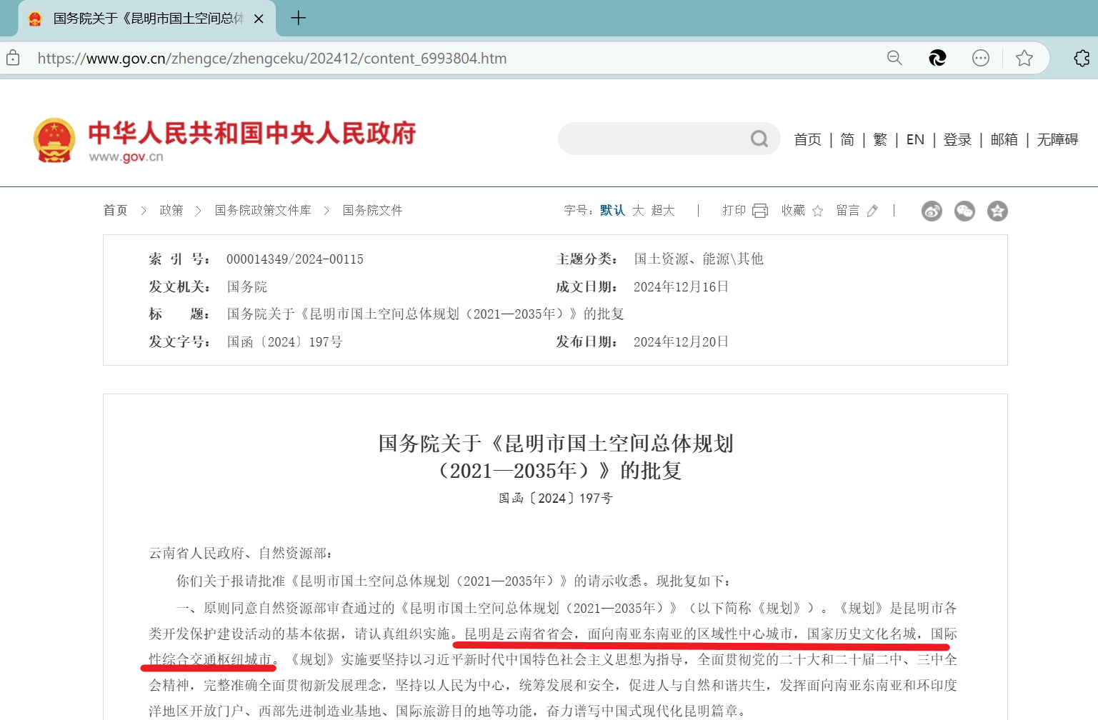 12月20日,国务院批复昆明市国土空间总体规划,明确了昆明面向南亚东南亚的区域性中心城市、国际性综合交通枢纽城市的定位。(信息来源:中国政府网。国务院关于《昆明市国土空间总体规划(2021—2035年)》的批复(国函〔2024〕197号))这意味着昆明作为链接中国经济腹心长江经济带和东南亚、南亚经济区的枢纽和对外开放前沿城市的地位的确立。昆明这个“东南亚经济首都”,也将迎来城市地位的跃升以及商务和投资的爆发。